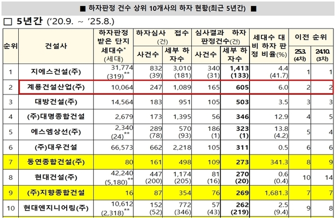 다만 품질과 현장 안전 문제는 계룡건설의 지속적인 리스크로 지적된다. 국토교통부 산하 하자심사분쟁조정위원회가 지난 10월 발표한 자료에 따르면 계룡건설은 최근 5년간 605건의 하자 판정을 받아 GS건설에 이어 두번째로 많았다. 세대수 대비 하자 판정 비율도 6.0%에 달한다. 실제 세종시 조치원 지역에서는 누수 피해로 수개월간 보수 공사가 이어진 사례가 공개되기도 했다.