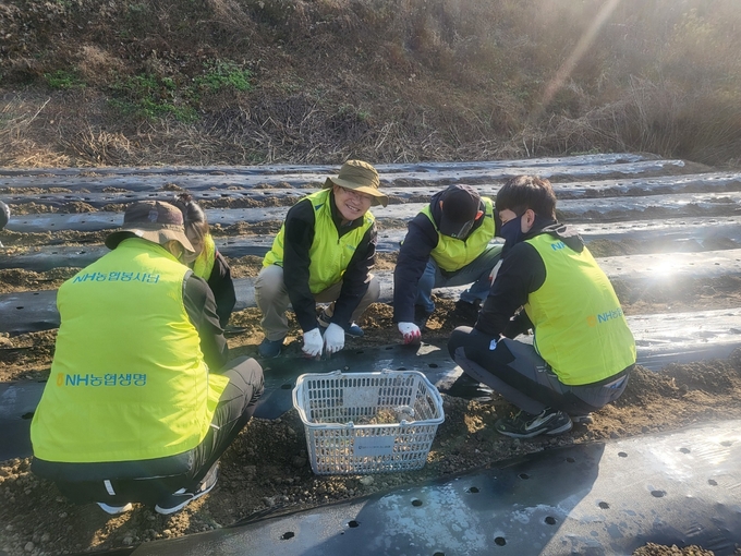 [FETV=장기영 기자] NH농협생명은 지난 19일 경기 성남시에 위치한 쪽파 재배 농가에서 일손돕기 봉사활동을 실시했다. 임도곤 부사장과 마케팅지원부 임직원 30여명은 이날 쪽파를 심고 농가 주변을 정리했다. 임 부사장(가운데)과 임직원들이 쪽파를 심고 있다. [사진 NH농협생명]