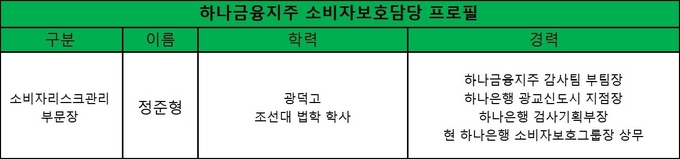 하나금융의 소비자보호체계 중심에 있는 소비자리스크관리부문장은 정준형 상무가 맡고 있다. 정 상무는 하나은행의 소비자보호그룹장도 함께 맡고 있다. 그는 하나금융지주에서 감사팀 부팀장, 하나은행에서는 광교신도시 지점장, 검사기획부장 등을 역임했다.