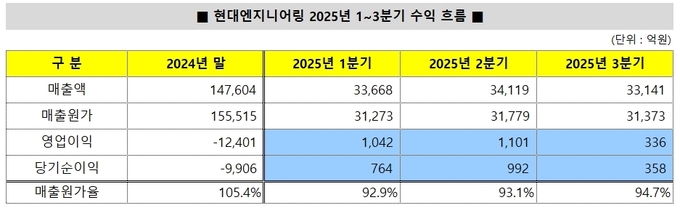 현대엔지니어링은 3분기 매출 3조3141억원, 영업이익 336억원을 기록했다. 전년 동기 대비 각각 12.5%, 35.6% 감소했지만 순이익은 358억원으로 흑자 전환했다.
