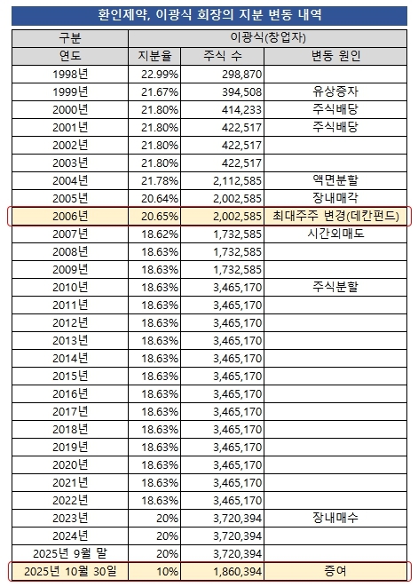 눈에 띄는 건 그 이전까지는 장남 이원범 사장에게 경영권을 넘기기 위한 주식 증여가 없었다는 점이다. 이원범 사장은 2010년으로 증여가 아닌 장내매수를 통해 처음으로 환인제약 주식을 보유했다. 이로부터 15년 뒤인 올해에서야 첫 증여를 받고 최대주주에 오른 셈이다.