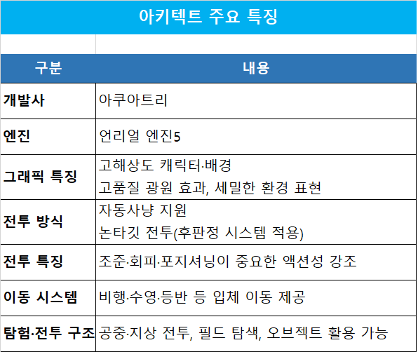 드림에이지의 첫 대형 퍼블리싱 타이틀 ‘아키텍트’는 지난 10월 22일 출시됐다. ‘리니지2 레볼루션’, ‘제2의 나라’를 개발한 박범진 대표의 '아쿠아트리'가 개발을 맡았다. 이 게임은 언리얼 엔진5 기반의 고해상도 그래픽과 광원 효과, 입체적 환경 표현을 강점으로 내세웠다. 자동사냥을 지원하면서도 논타깃 전투와 후판정 시스템을 적용해 조준·회피·포지셔닝이 중요한 액션성을 구현했으며 비행·수영·등반 등 입체 이동을 도입해 필드 탐색과 전투 경험을 차별화했다.