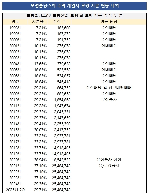 결과적으로 오너 2세 김은선 회장이 지배하는 보령홀딩스는 2004년부터 주력 계열사 보령의 최대주주로 올라섰다. 2024년 오너 3세 김정균 사장이 이끄는 보령파트너스가 보령의 유상증자로 참여하면서 보령홀딩스의 지분율이 줄었지만 여전히 지분구조의 상단에 위치한다.