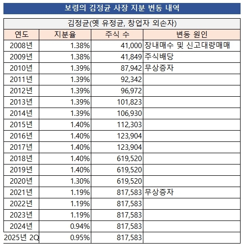 특히 보령홀딩스가 2008년과 2013년에 걸쳐 보유 중인 보령바이오파마(옛 보령신약) 지분을 김정균 사장과 보령수앤수에 넘기 힘을 실어줬다. 이후 보령수앤수에서 인적분할한 보령파트너스가 2024년 보령바이오파마 지분을 외부에 매각하면서 현금을 유입시켰다.