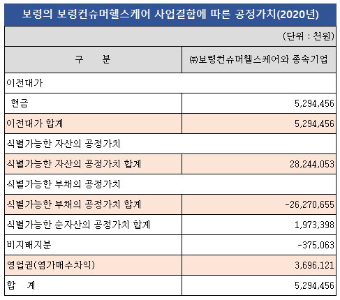 이후 2020년 보령이 보령홀딩스가 보유한 보령컨슈머헬스케어 지분 100%을 취득했다. 이전 대가는 53억원이다. 식별가능한 순자산의 공정가치 합계 20억원에 비지배지분(4억원)을 차감한 후 영업권 37억원을 더한 값이다.