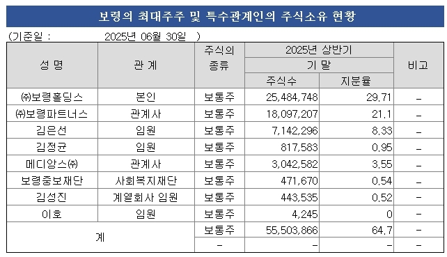 이로써 2025년 상반기 말 기준 보령파트너스는 21.1% 지분을 보유한 보령의 2대 주주로 올라설 수 있었다. 최대주주인 보령홀딩스의 지분은 37.1%에서 29.71%로 줄어들 수밖에 없었따. 보령홀딩스와 보령파트너스 간 지분율 격차는 8.61%p다.