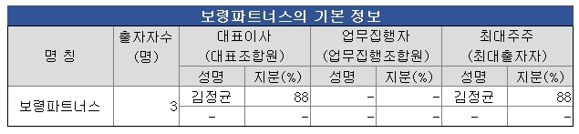 지난해 말 기준 보령파트너스가 매도가능증권으로 인식한 곳은 코레이트BR전문투자형 사모부동산투자신탁 13호 2종(지분율 50%, 취득원가 50억원), Cheer Talent(5.26%, 11만원), 보령바이오파마(18.3%, 804억원)다.