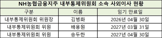 이사회 의장은 올해 1월부터 임기 1년으로 김병화 사외이사가 맡고 있다. 김병화 사외이사는 지난해 4월부터 농협금융의 사외이사 임기를 시작했다.