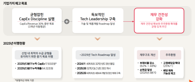 투자 기조도 변화했다. DART 현금흐름 기준 2025년 3분기 유형자산 취득액은 1조5648억원, 처분액은 1조446억원으로 설비투자 속도가 관리 가능한 범위에 머물렀다. 회사의 3개년 이동평균 CAPEX매출 비중은 27.8%로, 과잉 증설을 피하며 공급 리스크를 억제했다는 평가다. 이는 업황 반등 구간에서도 공급량을 조절하며 제품 믹스를 고부가 구조로 전환하는 데 기여했다.