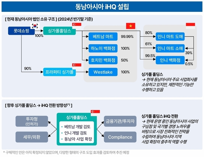 당시 유통군HQ 조직이 위치한 롯데쇼핑 측에서는 싱가폴홀딩스에 신설되는 iHQ에서 동남아 사업을 총괄하는 구조로 iHQ를 이끄는 대표도 선임할 계획이라고 설명했다. 이전까지 싱가폴홀딩스는 동남아 법인을 소유하기 위해 구성된 특수목적법인(SPC)에 불과했다.