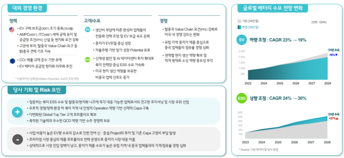 미이행 항목도 분명하다. EV 둔화가 장기화되며 고니켈 중심 수익성 회복이 지연되고 있고, ESS 확대로 전동화 편중 리스크를 낮추고는 있지만 EV 공백을 완전히 메우기엔 제한적이라는 분석도 있다.
