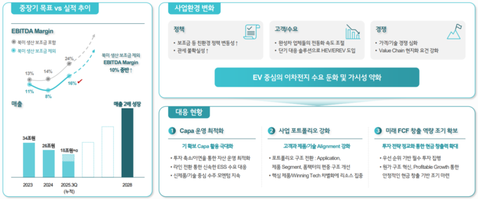 외형 확장 중심 전략에서 현금흐름·포트폴리오 중심 구조로 전환하는 과정에서 나타난 과도기적 조정이라는 평가다. LG에너지솔루션은 ▲매출 2배 성장(34조→68조 이상) ▲Non-EV 비중 40%대 확대 ▲EBITDA 마진(보조금 제외) 10% 중반 회복 ▲안정적 FCF·ROIC 기반 확립 등을 약속했고, 탄력적 CAPEX 조정과 자산 효율화를 통해 이익 변동성을 낮추고 EV 편중을 완화하겠다는 계획도 제시했다.