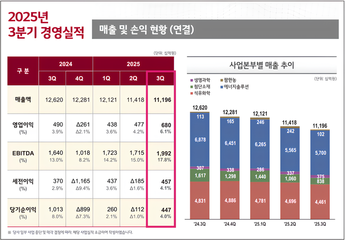 그러나 지난해부터 이어진 글로벌 정세 불확실성, 석유화학 시황 부진, 주요국 친환경 정책 축소 영향으로 매출 감소와 영업이익 둔화가 발생했다. 다만 HVO(친환경 바이오 오일)·Recycle 중심 지속가능성 사업과 전지소재 고객 다변화, 항암제 임상 진전 등 신사업에서 일부 성과가 나타나며 성장 방향 자체는 유지했다는 설명이다.