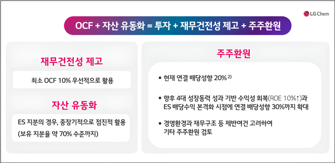 재무 전략에서도 중장기 방향성을 유지하고 있다. LG화학은 우선순위 기반의 선별적 투자, 순차입금 유지·감소를 통한 재무건전성 관리, 성과 기반 주주환원 체계를 원칙으로 삼고 있다고 밝혔다. 또 장기적으로는 LG에너지솔루션 보유 지분을 약 70% 수준까지 점진적으로 활용하겠다는 입장도 내놨다.