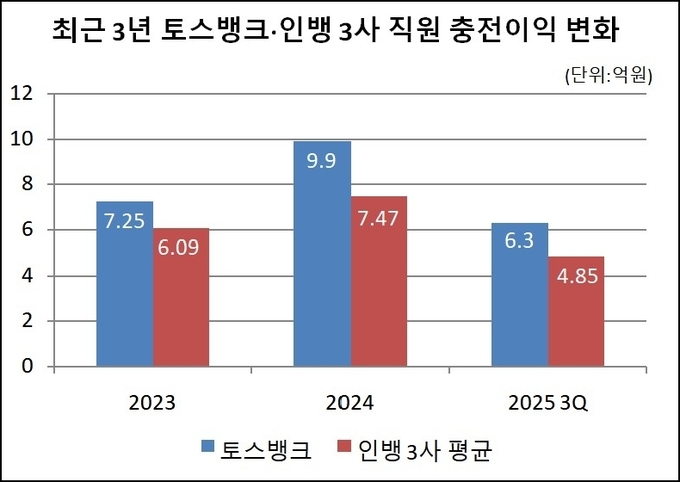 3분기까지 토스뱅크는 인터넷전문은행 3사(카카오뱅크·케이뱅크·토스뱅크) 중 가장 높은 수준을 유지하고 있다. 3분기 1인당 충당금적립전이익의 3사 평균은 4억8500만원이다.