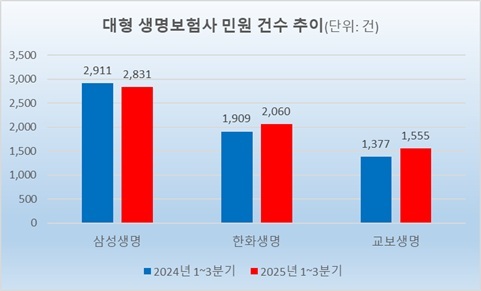 한편 삼성생명, 한화생명, 교보생명 등 3개 대형 생보사의 올해 1~3분기(1~9월) 민원 건수는 6446건으로 전년 동기 6197건에 비해 249건(4%) 증가했다. 같은 기간 삼성화재, DB손해보험, 메리츠화재, 현대해상, KB손해보험 등 5개 대형 손보사의 민원 건수는 2만3719건에서 2만3805건으로 86건(0.4%) 늘었다.
