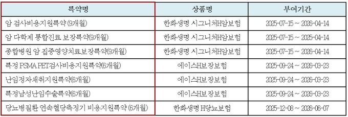 한화생명은 지난 7월 ‘한화생명 시그니처 H암보험’ 특약 3종(9개월)을 시작으로 9월 ‘에이스 H보장보험’ 특약 3종(6개월), 12월 ‘한화생명 H당뇨보험’ 특약 1종(6개월)에 대한 배타적 사용권을 획득했다.