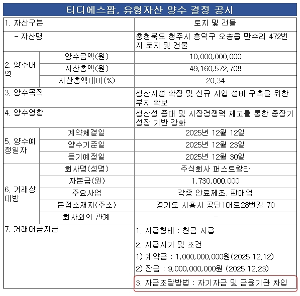 티디에스팜은 최근 생산시설 확장과 신규 사업 설비 구축을 위해 퍼스트칼라로부터 100억원에 토지 및 건물(충청북도 청주시 흥덕구 오송읍 만수리 472번지)을 양수하기로 결정했다고 공시했다. 이를 통해 중장기 성장 기반을 강화할 계획이다.