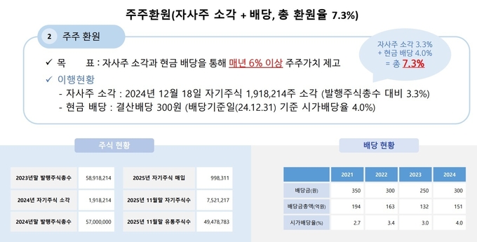 2025년에도 환원 기조는 이어진다. 연중 두 차례에 걸쳐 총 99만8311주의 자사주를 매입했고, 연말에는 기존 보유 자사주 200만주를 추가 소각했다. 배당은 주당 300원을 유지하며 배당성향을 40% 이상으로 끌어올린다는 방침이다. 단기 이벤트성 환원이 아닌, 중기 정책으로 환원을 구조화하겠다는 메시지다.