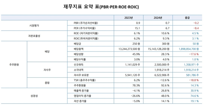 이 같은 실적 개선은 자본 효율성 지표로 이어졌다. ROE(자기자본이익률)는 2023년 6.1%에서 2024년 10.93%로 상승했다. 실적 반등이 단순한 외형 회복을 넘어 자본 수익성 개선으로 연결됐다는 점에서 밸류업의 1차 조건은 충족됐다는 평가다.