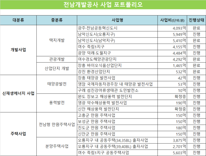 전남개발공사의 사업 포트폴리오는 도시·산업단지·신재생에너지 개발과 주택 분양 등으로 다각화돼 있다. 도시개발 부문에서는 광주·전남공동혁신도시와 여수 경도 해양관광단지를 완료했고 남악신도시와 여수 죽림·광양 덕례·도월지구 등에서는 수십만㎡ 규모 택지 개발을 단계적으로 진행 중이다.