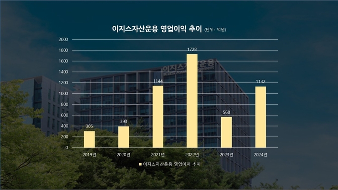 한편 한 때 주춤했지만 지난해 이지스자산운용의 영업이익은 회복중이다. 2019년 305억원 수준이었던 영업이익은 2021년 1144억원, 2022년 1728억원까지 증가했다. 2023년 568억원까지 내려앉았지만 지난해 1132억원으로 반등했다.