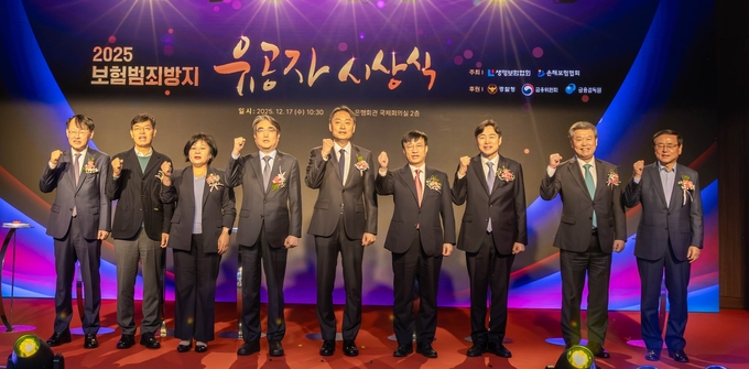 [FETV=장기영 기자] 생명보험협회와 손해보험협회는 17일 서울 중구 은행회관에서 ‘2025년 보험범죄방지 유공자 시상식’을 개최했다. 이번 시상식에서는 경찰과 보험업계 조사자 등 총 125명이 유공자로 선정돼 상을 받았다. 시상식 참석자들이 기념촬영을 하고 있다. (왼쪽부터) 최유삼 한국신용정보원 원장, 안철경 보험연구원 원장, 김미영 금융감독원 부원장, 김범기 금융위원회 상임위원, 박우현 경찰청 사이버수사심의관, 김철주 생보협회 회장, 이병래 손보협회 회장, 허창언 보험개발원 원장, 강영구 한국화재보험협회 이사장. [사진 생명보험협회]