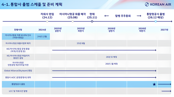그러나 올해 계획에서는 통합 로드맵이 보다 명확해졌다. 대한항공은 올해 8월 화물사업부 매각을 시작으로 2026년 말 본사 합병, 2027년 LCC·자회사 통합 등 지속적으로 이어지는 연도별 일정을 제시했다. 이는 통합 과정에서 주요 절차를 시점별로 정리하며 시장의 불확실성을 낮추려는 시도로 해석된다.