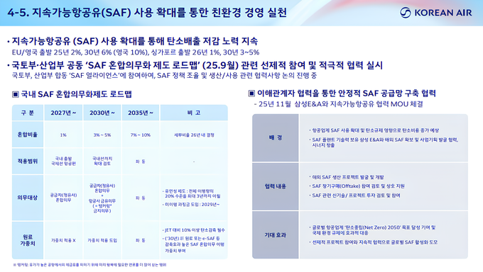 ESG 부분에서는 SAF 확대와 동급 기종 대비 좌석당 탄소 배출량이 20~25% 적은 고효율 항공기 도입을 예고했다. 또 올해는 정부의 SAF 혼합 의무화 제도 시행에 따라 2027년부터 이어지는 SAF 혼합 의무화 로드맵을 별도 항목으로 다루며 규제 대응 전략을 정리했다.