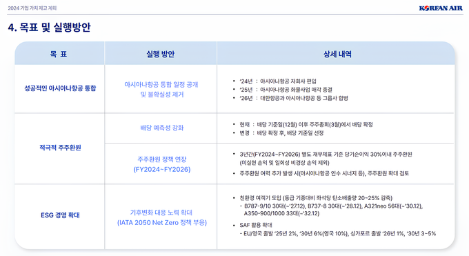지난해 대한항공의 기업가치 제고 계획은 아시아나항공 인수 이후 통합 항공사의 청사진을 시장에 설명하는 데 무게가 실렸다. 지난해 계획의 경우 아시아나항공이 대한항공 자회사로 편입된 이후 단일 FSC(대형 항공사) 체제로 전환한다는 점과 함께 통합 시너지, 규모의 경제, 운영 효율성 제고 등을 강조했지만 단계별 일정이나 효과에 대한 언급은 제한적이었다.