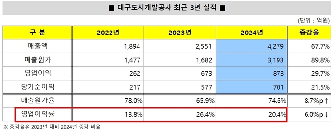 수익성은 대구도시개발공사가 진행하는 대형 프로젝트의 채산성이 얼마나 우수한지를 단적으로 보여준다. 2020년 이후 수성알파시티 청아람과 죽곡4단지 분양전환에 따른 주택 판매 수익이 반영됐고 금호워터폴리스 택지 분양이 본격화되며 영업이익률은 가파르게 개선됐다. 2023년 26.4%, 2024년 20.4%라는 두 자릿수 후반의 수익성은 공공 개발사로서는 이례적인 수준이다.