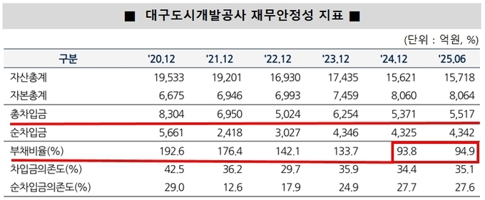 그럼에도 재무 안정성에 대한 시장의 평가는 긍정적이다. 2025년 6월 말 기준 총차입금 5517억원 가운데 단기성 차입금은 709억원에 불과하다. 유동성 회사채가 대부분을 차지하지만 1176억원에 달하는 현금성 자산과 향후 용지 매각 대금, 공사채 발행 여력을 감안하면 대응 수단은 충분하다는 평가다. 대구광역시 산하 공기업으로서 확보한 대외 신인도 역시 추가 자금 조달의 안전판으로 작용한다.