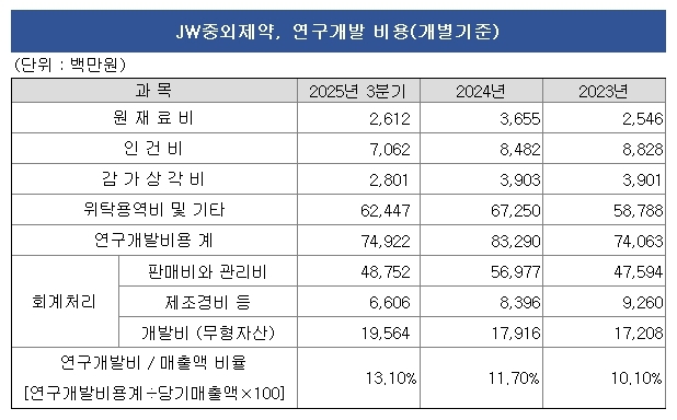 올해 3분기 기준 JW중외제약의 개별기준 매출 대비 R&D 비율은 13.1%다. 혁신형 제약기업 중 일반 제약사 28개 중 사업보고서에 R&D 비율을 미기재한 곳을 제외하면 JW중외제약은 상위 30% 안(7위)에 속한다. R&D 비율이 2024년(11.7%) 대비 1.4%p 상승한 결과다.