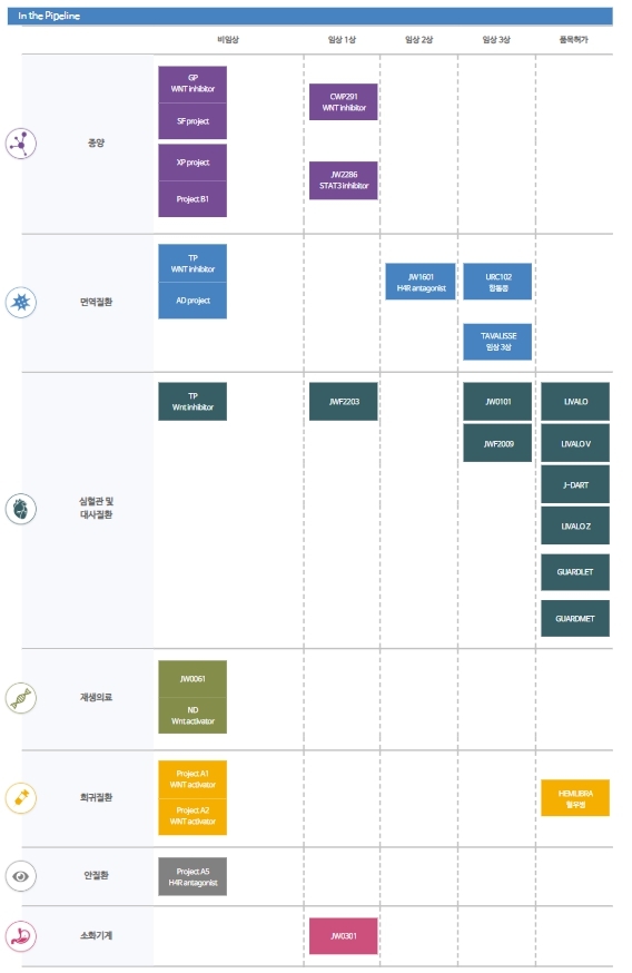 특히 연구개발 실적 및 향후 계획을 살펴보면 JW1601(안질환 치료제)는 임상 2상 진행 중, 신약 연구 중인 Epaminurad(통풍치료제)는 대만, 싱가포르, 태국, 말레이시아에서 임상 3상 진행 중인 단계에 있다. 그만큼 임상 승인 실적을 지니고 있다는 의미다.