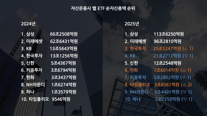 운용사별로는 삼성자산운용(113조6250억원)과 미래에셋자산운용(96조2810억원)이 압도적인 규모로 선두권을 유지했다. 한국투자자산운용(25조5247억원)은 KB자산운용(21조2717억원)을 제치고 상위권에 올라섰고 한화자산운용(7조6014억원)도 키움투자자산운용(5조2802억원)보다 앞서며 순위가 상승했다. 타임폴리오자산운용(3조8561억원)은 10위에서 8위로 올라섰다. 삼성액티브자산운용은 자회사인데도 순자산총액 1조1793억원으로 11위를 기록했다.