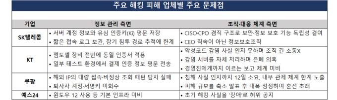 잇따른 사고의 원인은 고도화된 해킹 기술보다는, 기업 내부의 기본적인 보안 관리 미흡에 있었다는 분석이 지배적이다. 정부 합동 조사 결과, 국내 주요 IT 기업들의 보안 체계는 기본 수칙조차 제대로 지켜지지 않은 사례가 다수 확인됐다.