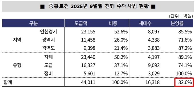 2025년 9월 말 기준 진행 주택사업 세대수는 약 1만6000세대이며 평균 분양률은 82.6%로 전반적으로 양호한 수준이다. 수도권 비중이 52.6%, 정비사업 비중이 12.7%로 사업 포트폴리오의 질적 구성도 비교적 안정적이다.