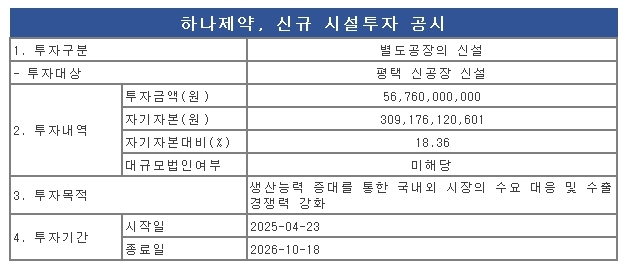 앞서 올해 4월 생산능력 증대를 통한 국내외 시장의 수요 대응과 수출 경쟁력 강화를 위해 평택 신공장을 신설한다고 공시했다. 이에 따른 총 투자금액은 568억원으로 투자기간은 2025년 4월부터 2026년 10월까지로 잡았다.
