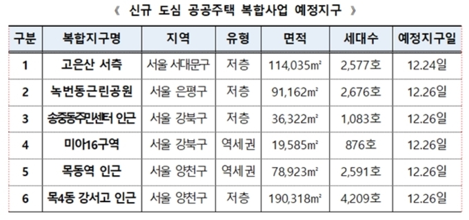 [FETV=박원일 기자] 한국토지주택공사(LH)는 ▲목동역 인근 ▲목4동 강서고 ▲고은산 서측 ▲녹번동근린공원 ▲송중동 주민센터 인근 ▲미아16구역 등 총 6곳이 도심 공공주택 복합사업(이하 도심복합사업) 예정지구로 지정 공고됐다고 26일 밝혔다.
