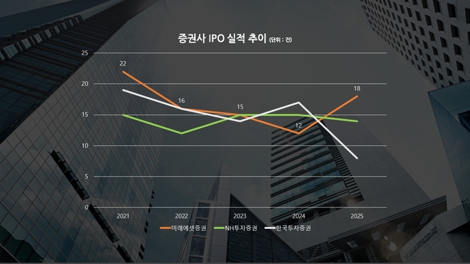 올해 순위는 지난해와 다른 양상이다. 2024년 미래에셋증권의 IPO 주선 실적은 12건에 그쳐 한국투자증권(17건)·NH투자증권(15건)에 이어 3위를 기록했다. 그러나 올해 들어 주관 건수가 늘며 1위를 탈환했다. 2020년부터 2023년까지 선두를 지켜온 미래에셋증권은 올해 다시 정상에 오르며 체면을 세웠다.