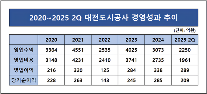 종합해보면 대전도시공사의 재무적 변동성은 일시적 부실보다는 분양 사이클에서 비롯된 구조적 특징에 가깝다. 안정적인 산업단지 임대 수익과 기반 시설 운영 수익을 바탕으로 분양 사업의 개시와 종료 시점에 따라 업사이클과 다운사이클이 반복되는 구조다. 2027년 이후에는 신규 분양과 산단 매출이 본격화되며 실적 회복이 기대되지만 내년은 투자 부담이 확대되는 다운사이클 구간에 놓일 가능성이 크다.