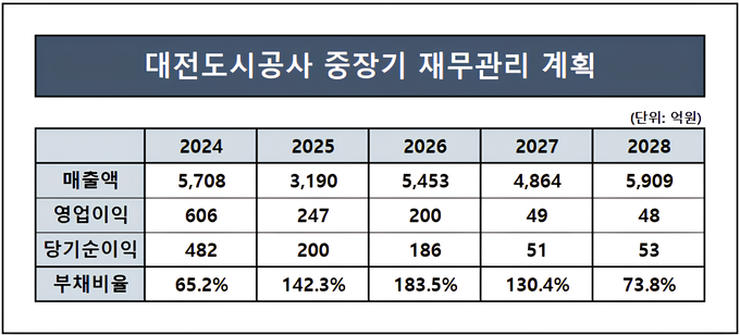 대전도시공사 역시 이러한 재무부담을 인식하고 있는 것으로 보인다. 지방공공기관통합공시 클린아이의 중장기 재무관리계획을 보면 대전도시공사의 부채비율은 2025년 142.5%까지 확대된 이후 2026년 180%대까지 상승한 뒤 다시 2027년 130%대로 하락하는 흐름이 제시돼 있다.
