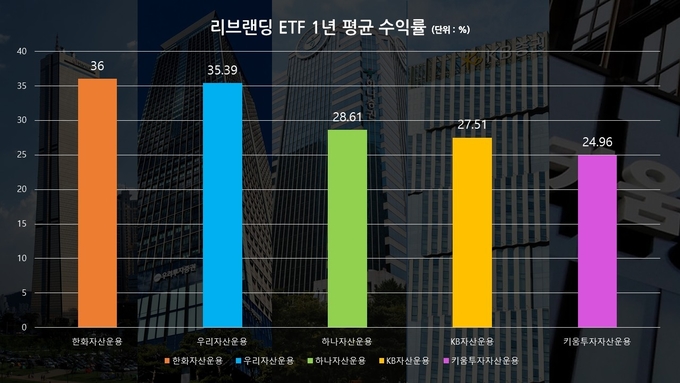 31일 한국거래소에 따르면 지난해부터 올해 1월까지 ETF 리브랜딩을 진행한 5개 자산운용사(하나자산운용·KB자산운용·한화자산운용·우리자산운용·키움투자자산운용) 가운데 최근 1년 평균 수익률이 가장 높은 곳은 한화자산운용(36.00%)으로 집계됐다. 지난해 말까지 상장된 ETF를 대상으로 했으며, 인버스·레버리지 상품은 제외했다.