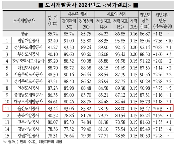 울산도시공사는 2007년 2월 울산광역시를 지역적 기반으로 택지개발, 임대주택 건설, 산업단지 개발사업을 수행하기 위해 설립된 지방공기업이다. 지난해 지방공기업 경영평가에서는 최종 점수 83.44점을 기록해 15개 광역개발공사 가운데 종합순위 11위에 머물렀다. 경영관리(83.06점)와 경영성과(83.82점) 모두 상대적으로 낮은 평가를 받았다.
