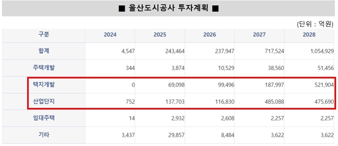 사업 확대에 따라 투자 규모도 급격히 늘고 있다. 울산도시공사 경영공시에 따르면 총투자금액은 2024년 4547억원에서 2025년 24조3464억원으로 크게 증가했고 2028년까지 100조원 이상으로 확대될 계획이다. 올해 택지개발 투자계획만 놓고 보면 2025년 대비 약 44% 증가한 9조9496억원에 달한다.