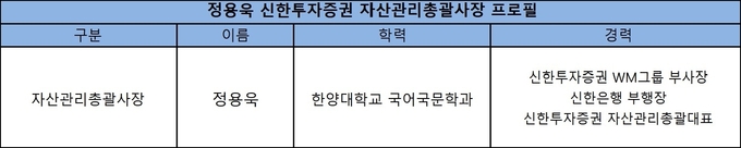 자산관리총괄대표는 당시 신한은행 영업추진4그룹장이었던 정용욱 전 부행장이 맡았다. 정 전 부행장의 증권·은행 겸직은 2024년 말까지 이어졌다. 지난해는 사장으로 승진하면서 자산관리총괄사장 업무를 수행했다.