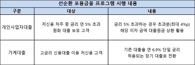 이번 프로그램은 개인사업자대출과 가계대출 고객을 대상으로 한다. 개인사업자대출은 일정구간 저신용 차주 중 금리 연 5%를 초과하는 원화 대출 보유 고객이 대상이다. 대출금리가 5%를 초과하는 경우 최대 4%p 초과분에 해당하는 이자 금액이 대출원금 상환에 활용되는 방식이다. 대출을 연기할 경우 자동 적용되며 부동산 임대·공급업 등 일부 업종과 연체 이력이 있는 경우 대상에서 제외된다.