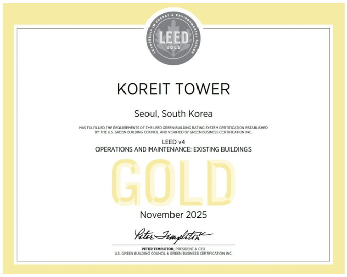 코레이트타워는 LEED의 인증 중에서도 ‘기존건물 운영·유지관리(O+M부문)’에서 골드(Gold) 등급 인증을 획득했다. 특히 O+M 인증은 ‘실제 운영 성과’를 중심으로 평가한다는 점에서 자산의 지속 가능한 관리 수준을 가늠하는 핵심 지표로 활용된다.