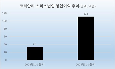 스위스법인의 영업이익은 34억원에서 111억원으로 77억원(222.2%), 당기순이익은 31억원에서 89억원으로 58억원(183.5%) 급증했다.
