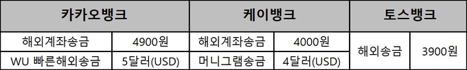 토스뱅크는 수수료를 건당 3900원으로 설정해 경쟁사 대비 수수료도 낮게 설정했다. 카카오뱅크의 경우 해외계좌송금 수수료는 4900원, 웨스턴유니온(WU) 빠른해외송금 수수료는 5달러(USD)다. 케이뱅크는 해외계좌송금 수수료는 4000원, 머니그램송금 수수료는 4달러(USD)로 운영하고 있다.